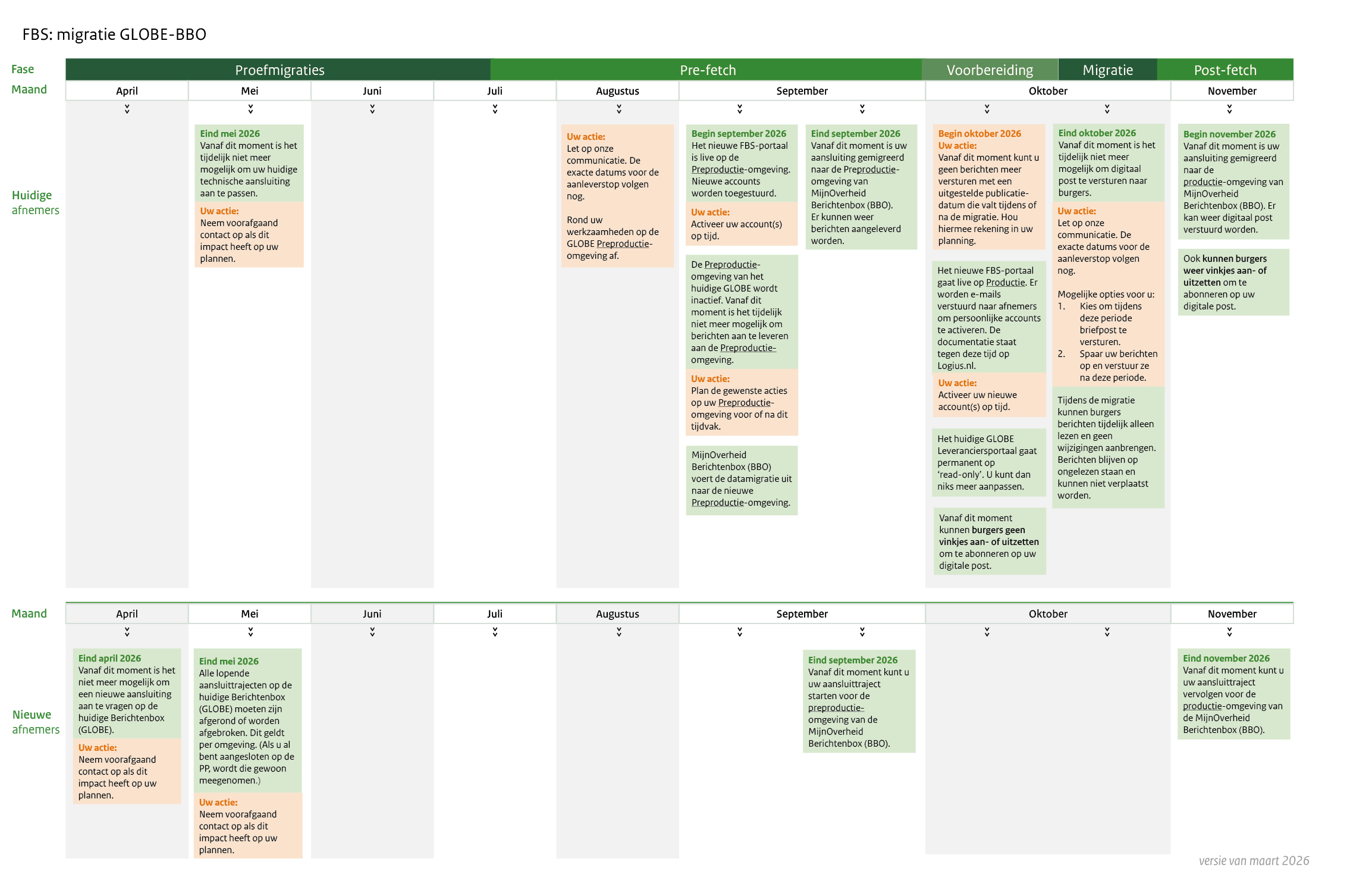 | Eind april 2026 | Vanaf dit moment is het niet meer mogelijk om een nieuwe aansluiting aan te vragen op de huidige Berichtenbox (GLOBE). | Neem voorafgaand contact op als dit impact heeft op uw plannen. |