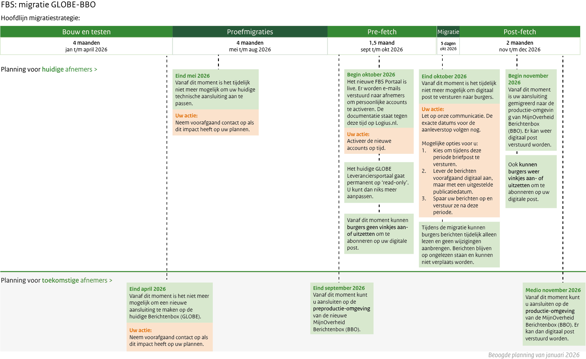 | Medio november 2026 | Vanaf dit moment kunt u aansluiten op de productie-omgeving van de MijnOverheid Berichtenbox (BBO). Er kan dan digitaal post verstuurd worden. |